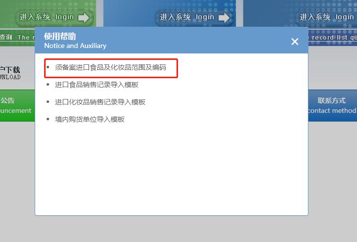 待出现以下界面后,点击“须备案进口食品及化妆品范围及编码”下载表格。