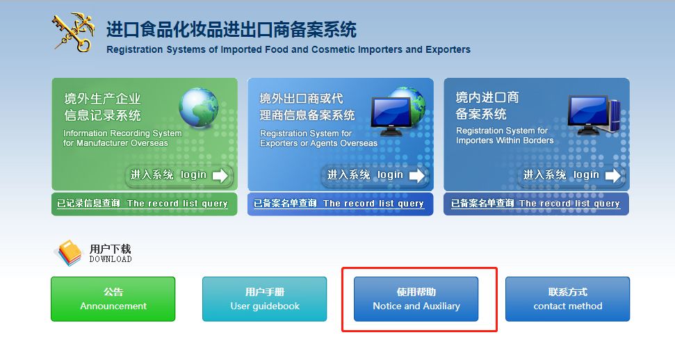 进入“进口食品进出口商备案管理系统”(http://ire.customs.gov.cn)点击“使用帮助”。